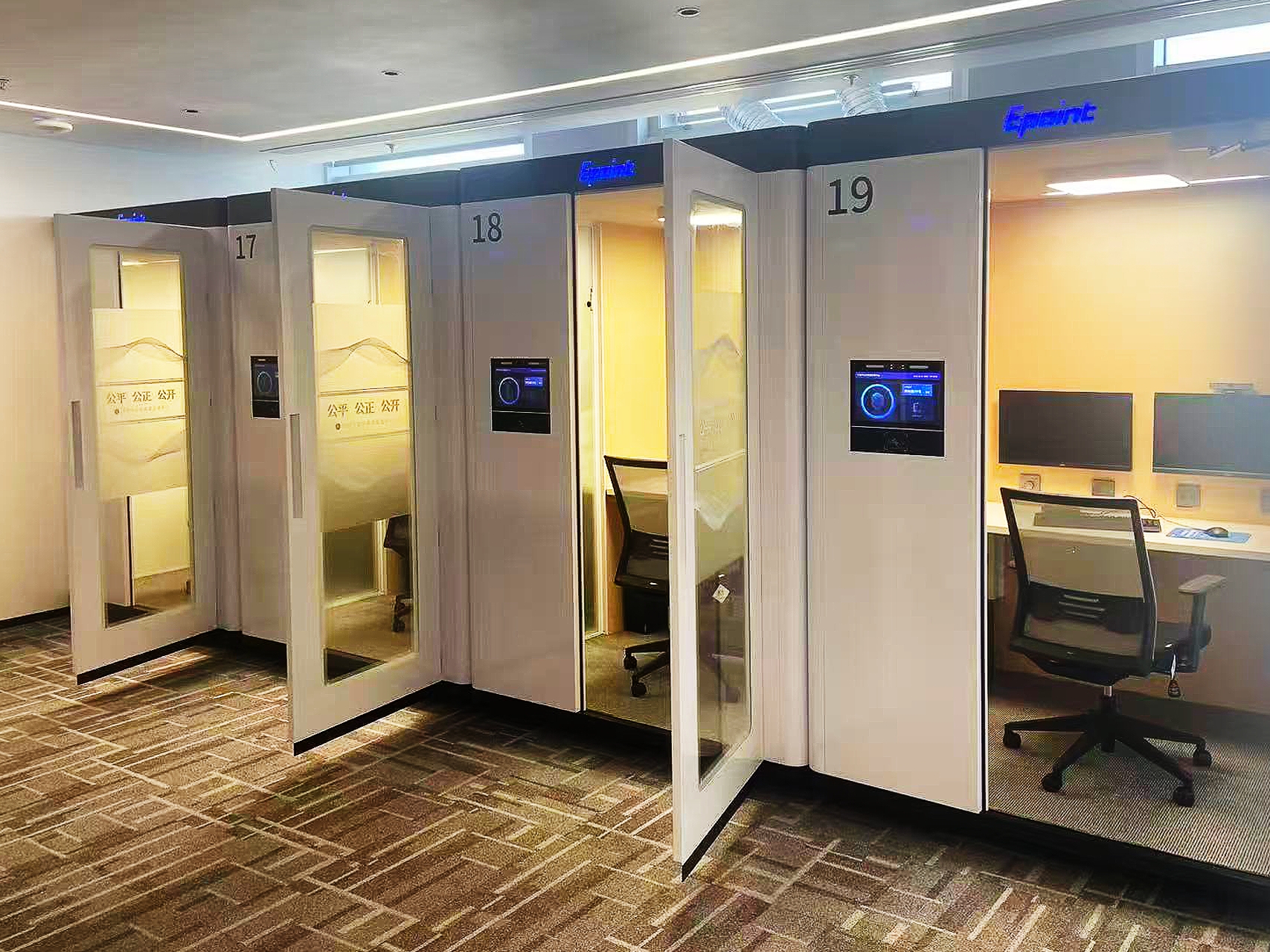走進交易中心評標室,映入眼簾的是一排排采用鋁合金型材、環(huán)保高效吸音材料,及高強度吸音鋼化玻璃一體化打造的獨立“智能評標艙”。每個艙體配備低噪聲新風系統(tǒng),為每位專家營造出“一人一艙”的封閉式專屬評標空間;專家“刷臉”進入,全程佩戴智能胸牌,人員軌跡無感、實時記錄,從物理環(huán)境上筑牢了評審獨立性與公正性的第一道防線。