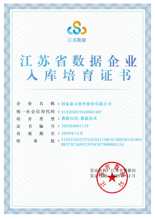 近日,江蘇省數(shù)據(jù)局正式發(fā)布江蘇省第一批入庫培育數(shù)據(jù)企業(yè)名單。經(jīng)過多輪嚴(yán)格篩選與綜合評審,新點(diǎn)軟件憑借在數(shù)據(jù)領(lǐng)域的深厚積累與綜合技術(shù)實力成功入選,獲評“數(shù)據(jù)應(yīng)用”“數(shù)據(jù)技術(shù)”培育資質(zhì),標(biāo)志著企業(yè)在數(shù)據(jù)創(chuàng)新與實踐方面獲得省級權(quán)威認(rèn)可。