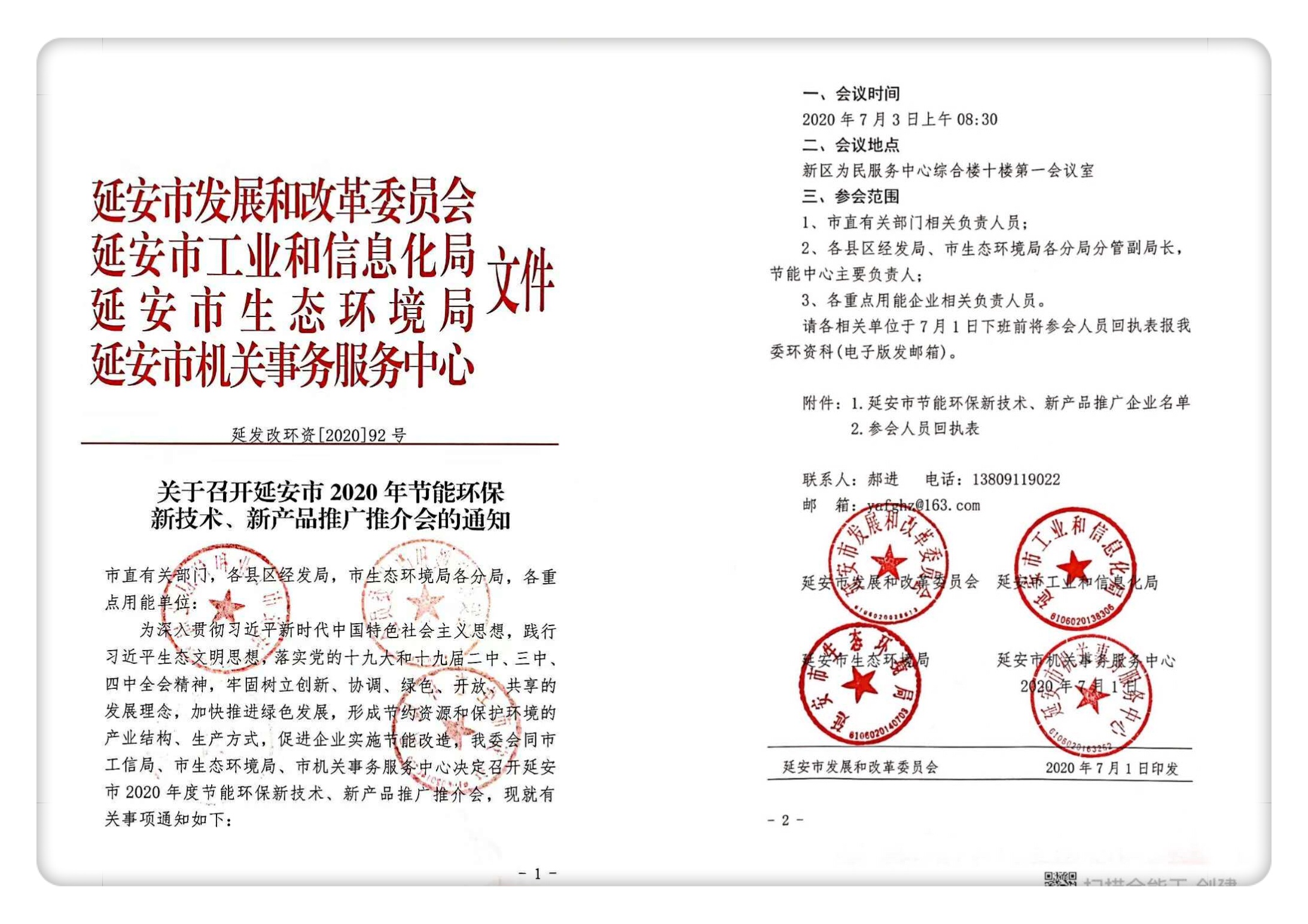 4、受延安市工信局、科技局、環(huán)保局、機(jī)關(guān)事務(wù)服務(wù)中心邀請(qǐng),參加“延安市2020年環(huán)保新技術(shù)新產(chǎn)品推介推廣會(huì)”。